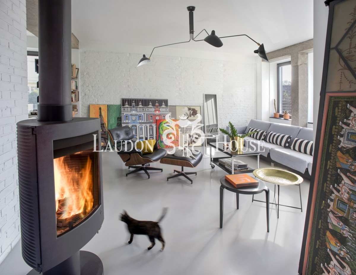 Z kuchni przechodzimy do otwartej jadalni, w której stoi oryginalny odnowiony stół z lat ’80 o wym. 340x100 cm. (dwunastoosobowy) oraz komplet krzeseł. W części salonowej mamy sofę z możliwością spania dla dwóch osób (dł. 394 cm) wykonanej na specjalne zamówienie przez firmę Kler. Dodatkowym elementem wystroju jest działający wolnostojący francuski piec kominkowy INVICTA PHAROS w kolorze antracytowym, obracany o 360" oraz stolik kawowy.