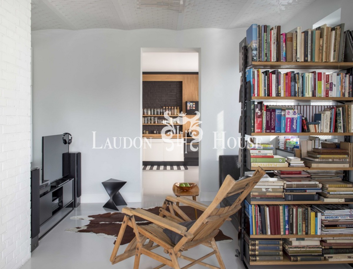 Na szczególną uwagę zasługuje sufit w części telewizyjnej, znajdujący się pomiędzy salonem, a kuchnią. Wykonany z hiszpańskich ceramicznych kafelków, stanowi oryginalną ozdobę tej części pomieszczenia. Przestrzeń tę uzupełnia skórzana sofa oraz wolnostojący regał na książki.