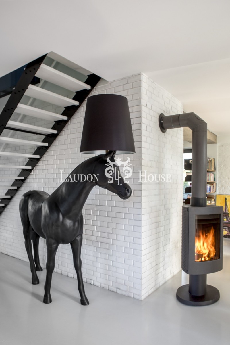 Centralnym punktem domu są czarne industrialne schody z pomalowanymi na biało dębowymi trepami,