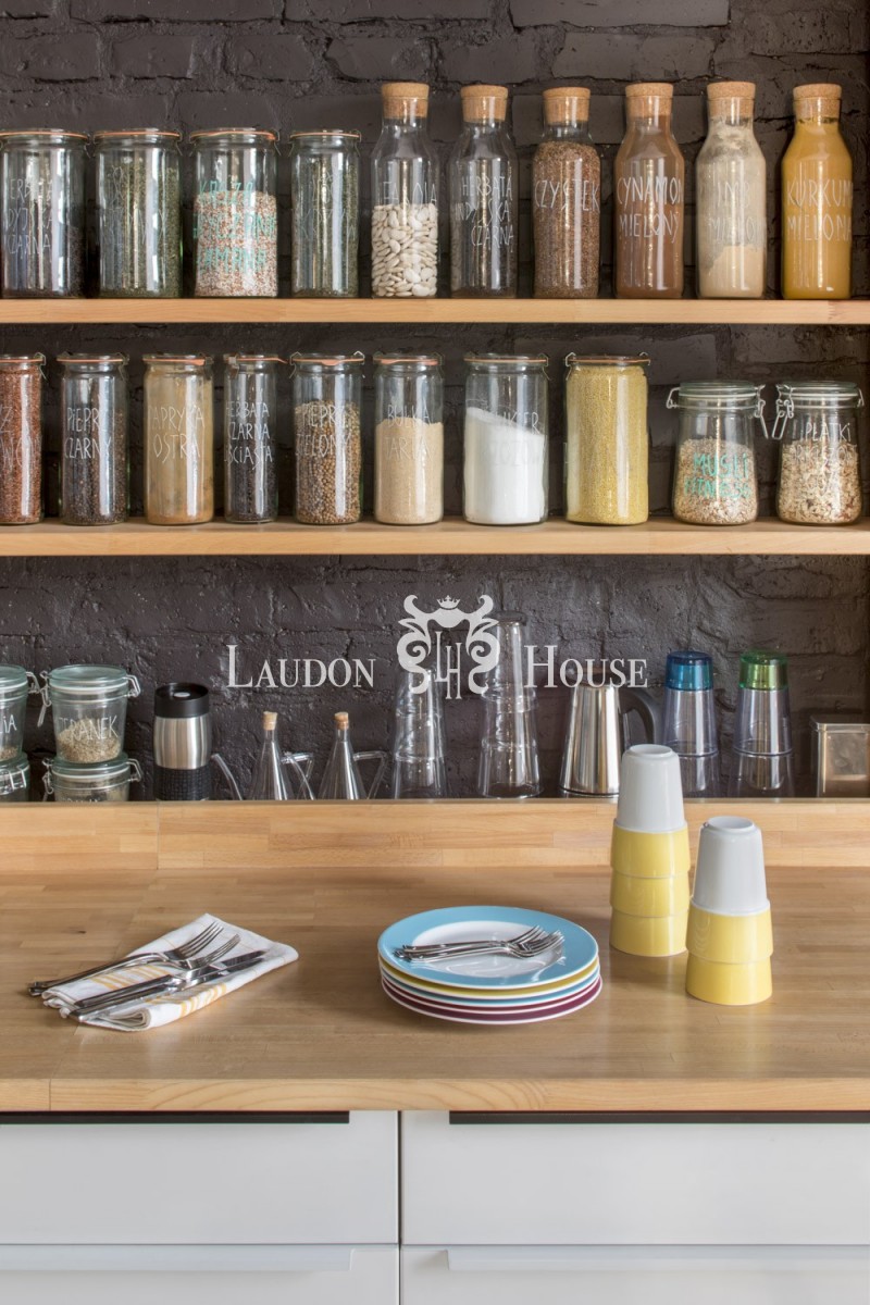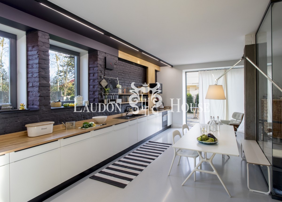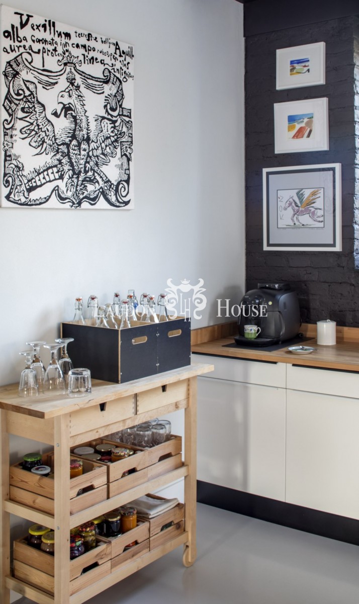 W kuchni znajdują się meble w zabudowie. Blat kuchenny wykonany został z dębowego drewna o długości 7 m.