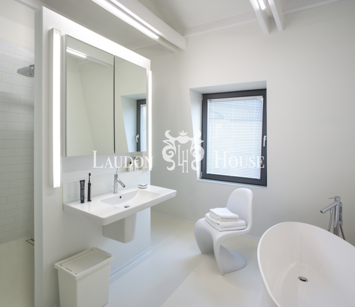 Na parterze dodatkowo znajduje się łazienka wyposażona w ceramiczny WC kompakt, oraz umywalka firmy Duravit (seria Verro), brodzik i kabina prysznicowa firmy SanSwiss wyłożona płytą gresową firmy Levantina (płyta bezfugowa). Ciekawym uzupełnieniem jest armatura łazienkowa firmy Axor zaprojektowana przez wybitnego twórcę sztuki użytkowej Philippe'a Stark'a (seria Organic) oraz podtynkowe radio firmy Gira.