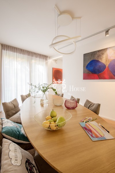 Do wykończenia wnętrz użyto naturalnych materiałów: kamień w kuchni i łazienkach oraz dębowy parkiet na podłogach. Podłogi w sypialniach oraz garderobie głównej pokryte zostały miękką wykładziną dywanową.