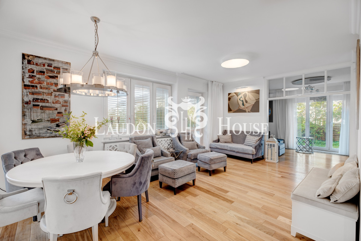Przy wejściu wita nas hol z praktyczną zabudową z szafą oraz elegancką toaletą gościnną. Stąd przechodzimy do strefy dziennej, na którą składa się przestronny, jasny salon, otwarta na salon, w pełni wyposażona kuchnia, jadalnia, która płynnie przechodzi w strefę wypoczynkową. Część salonu oddzielona przeszklonymi drzwiami może służyć jako pokój TV, biblioteka lub gabinet. Przedłużeniem salonu jest przestronny (30mkw), zadaszony taras, idealne miejsce do biesiadowania, czy relaksu przy każdej pogodzie, z tarasu rozciąga się widok na prywatny ogród.